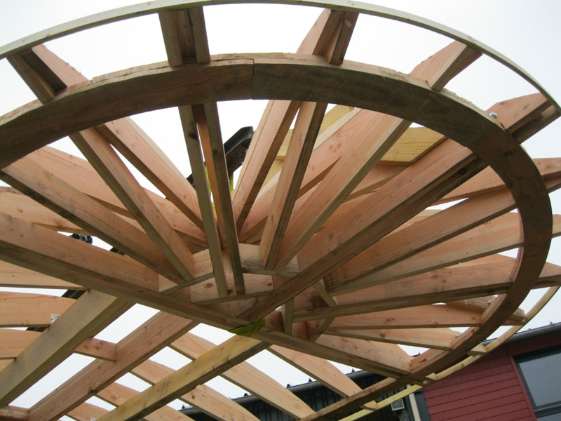 Projet : Construction du groupe scolaire de Magny-la-Campagne. Description des techniques : Charpente bois traditionnelle.