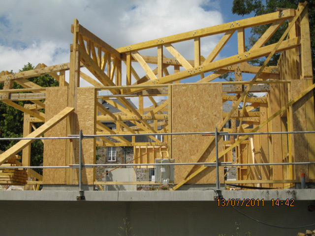 Projet : Construction de 20 logements à St Georges du Bois. Desciption des techniques : Charpente traditionnelle bois + fermettes.